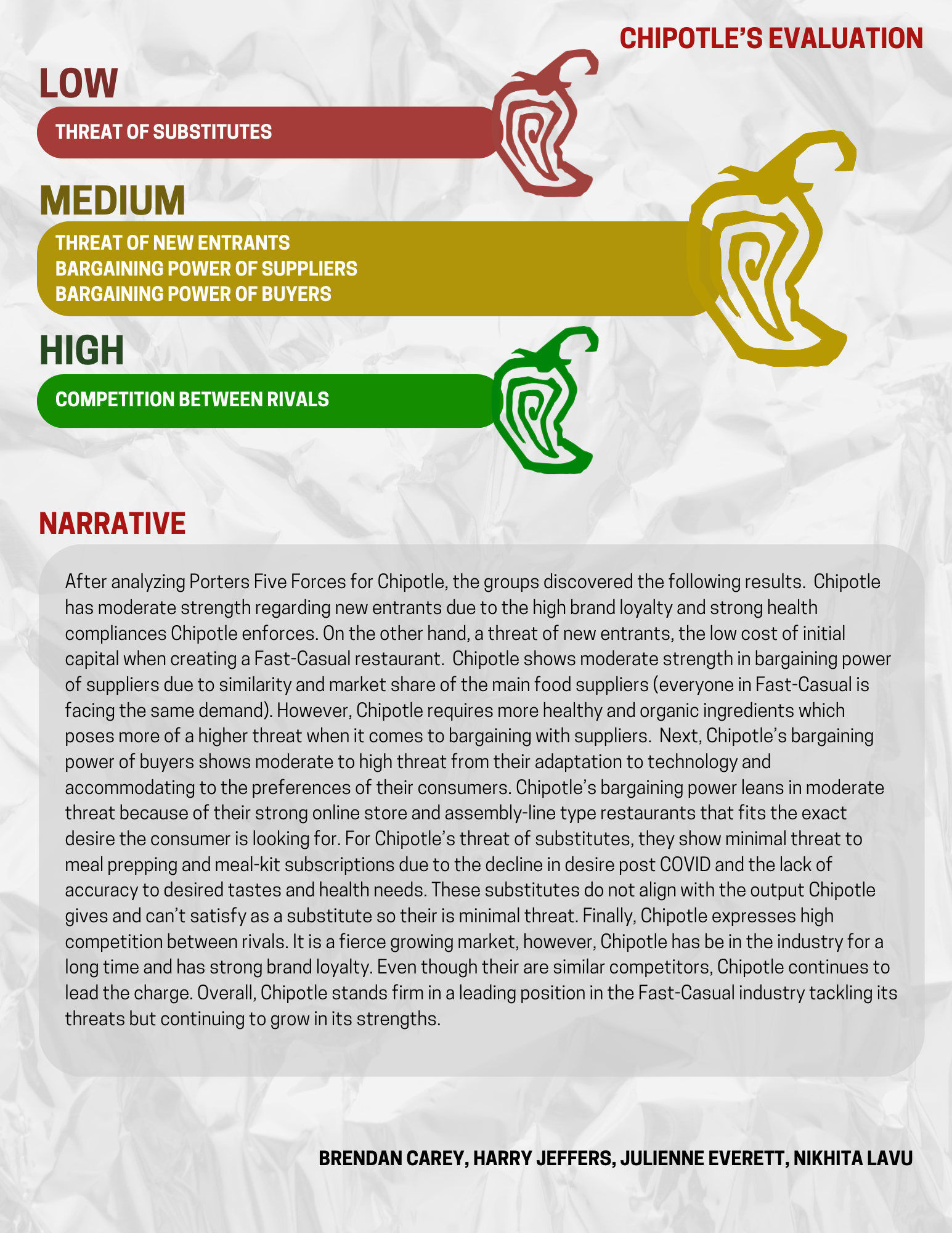 For a Strategic Management project, my team conducted a Five Forces analysis, evaluating Chipotle’s strengths, weaknesses, opportunities, and external threats. I was responsible for designing all content for both the Five Forces analysis and the final presentation. I incorporated Chipotle’s logo, products, and typography, and used an aluminum foil background to reflect their burrito-wrapping theme, while maintaining their brand colors throughout.